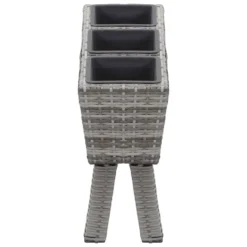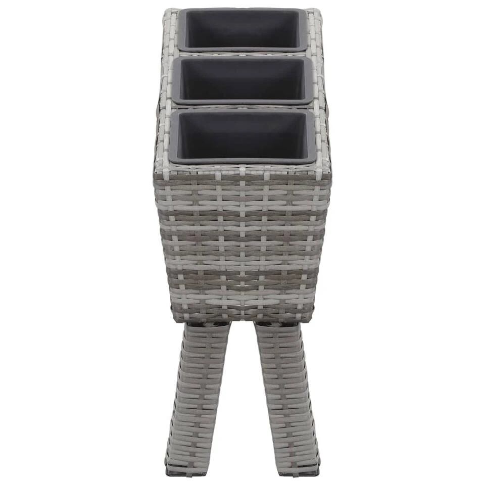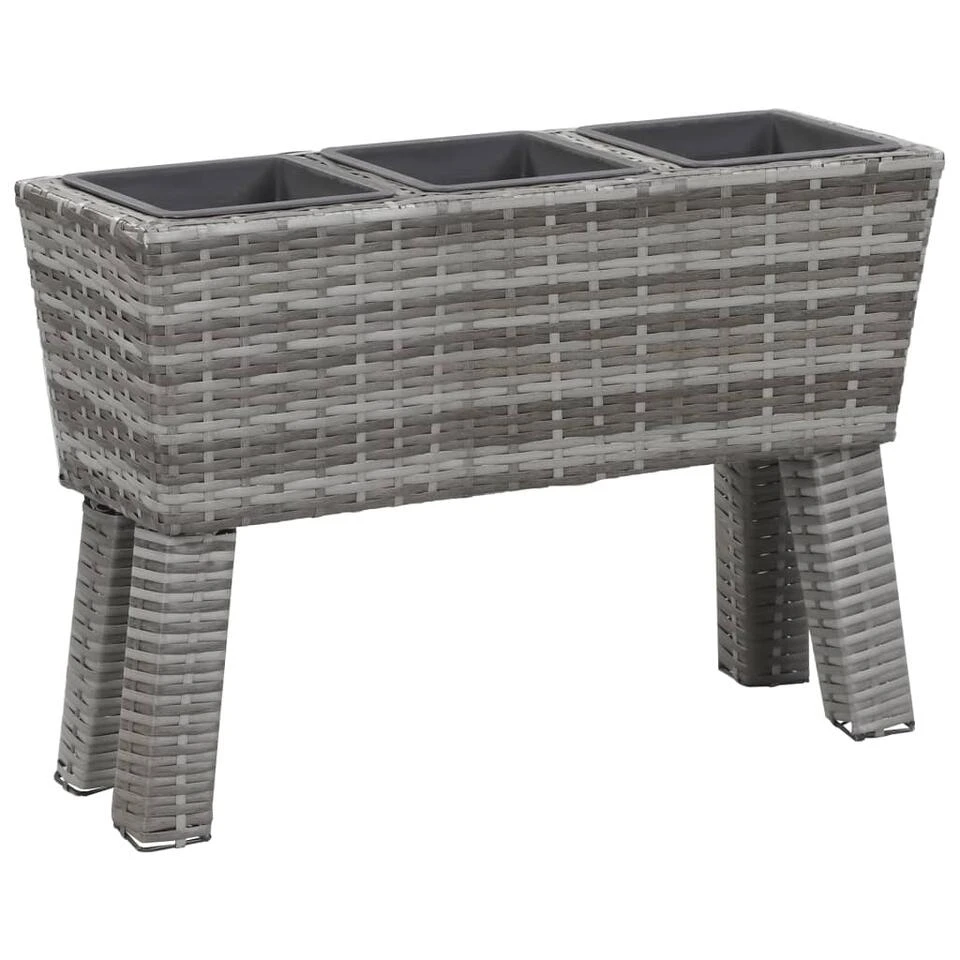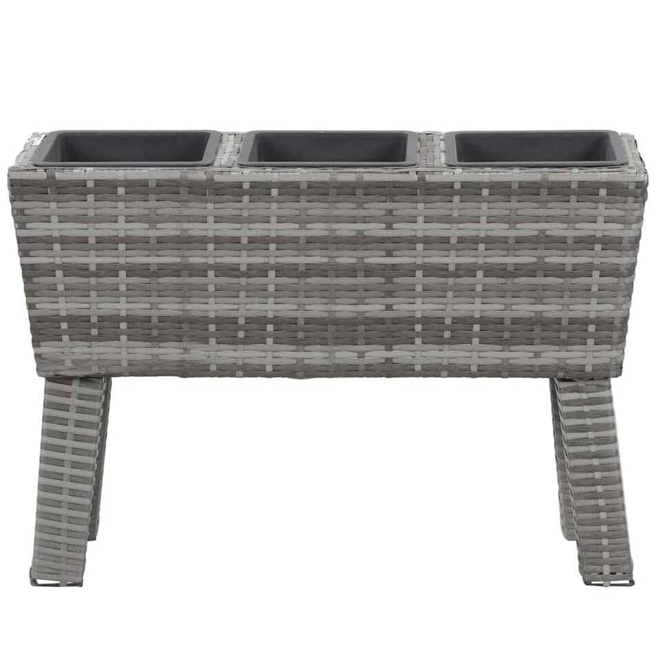 Deze mooie verhoogde tuinbakkenset bestaat uit 1 poly rattan plantenbak met poten en 3 kunststof potten.